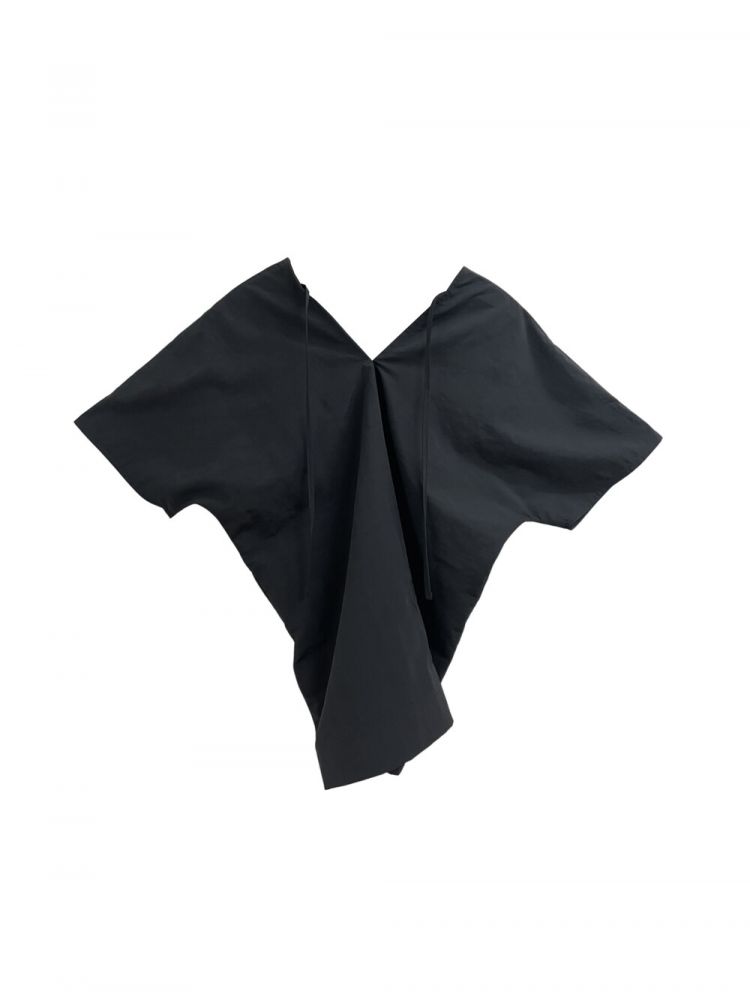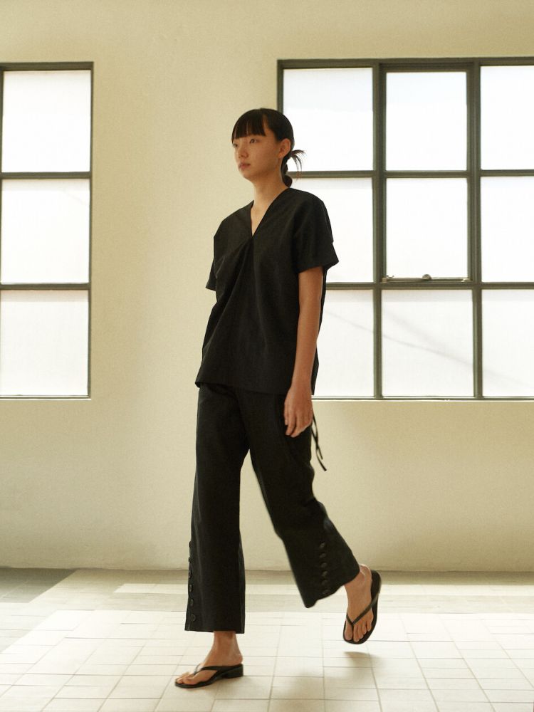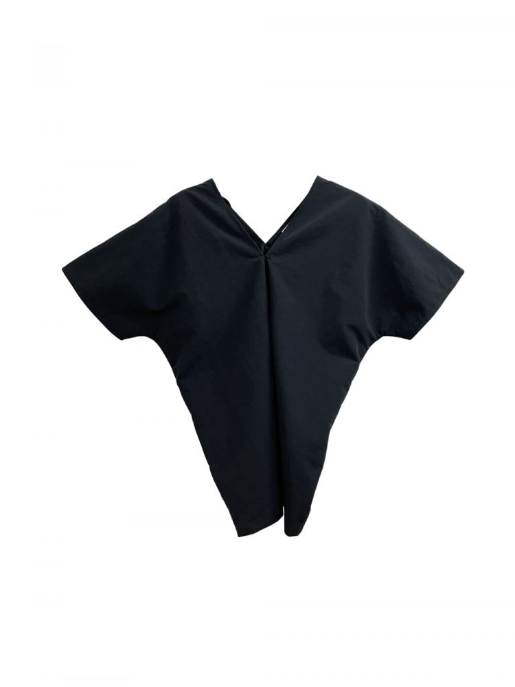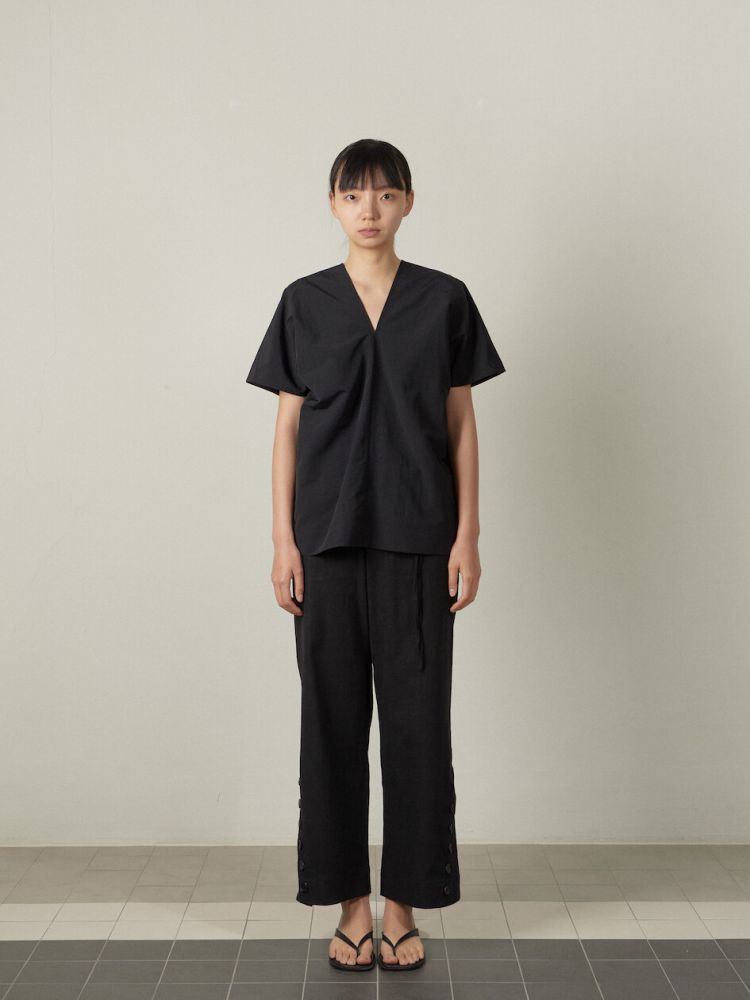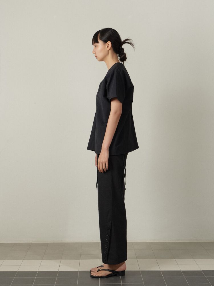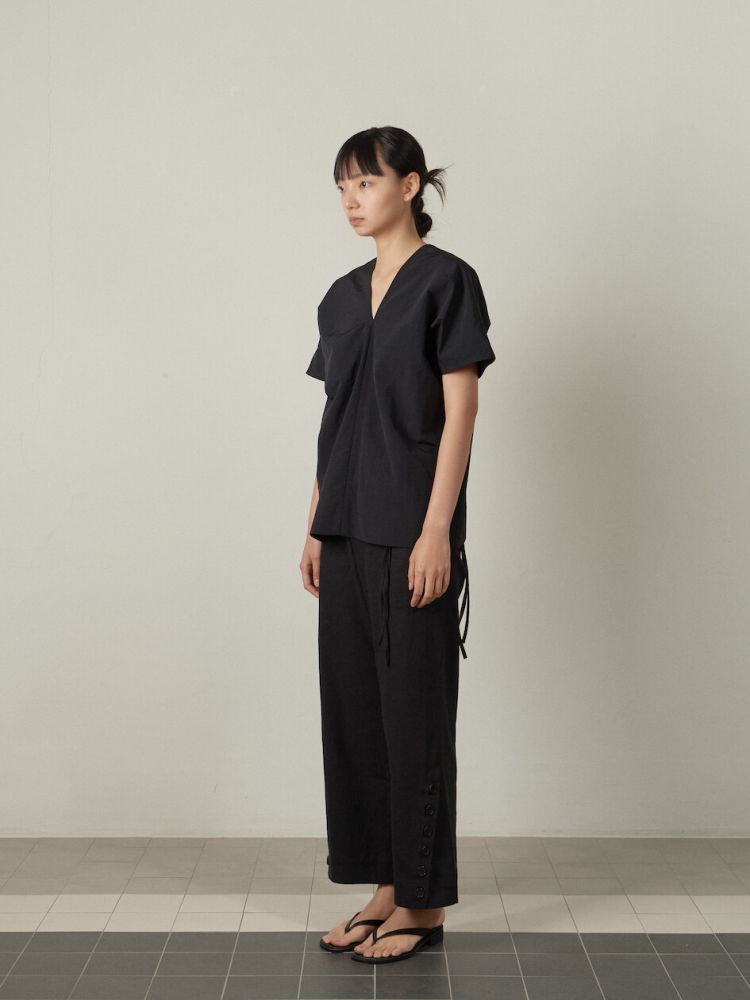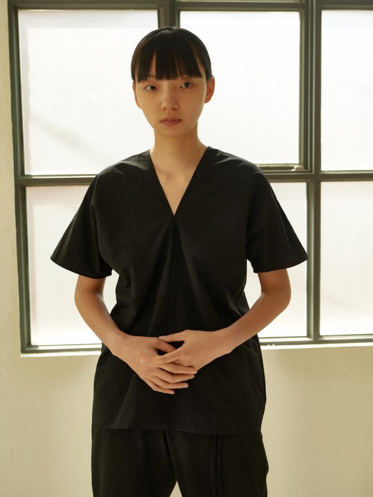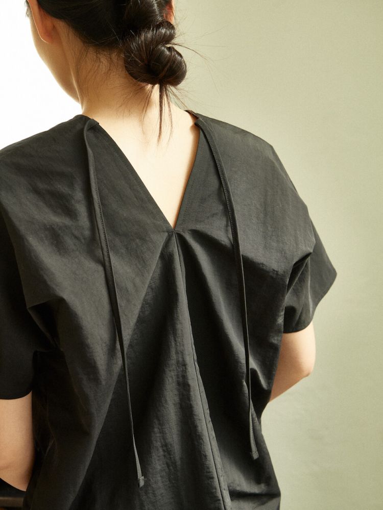 구조적인 실루엣의 하프 슬리브 블라우스백 라인 스트랩 디테일
