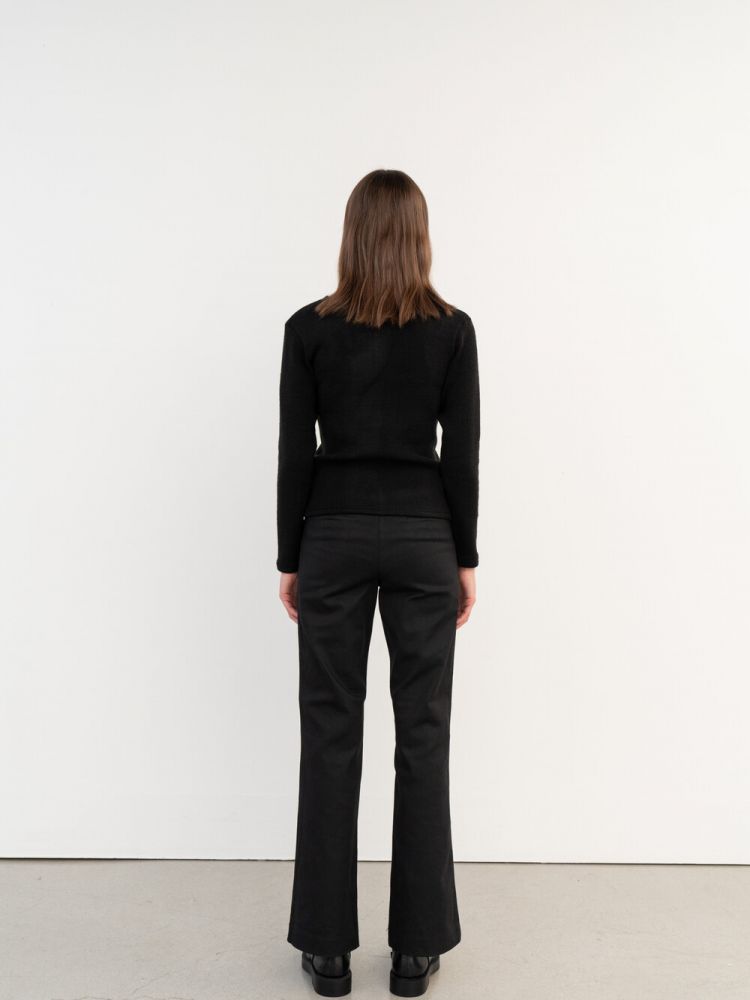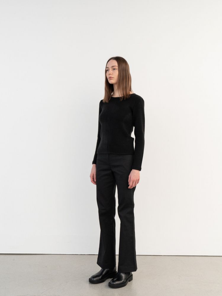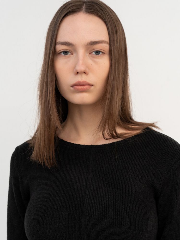 A light knit top made of stretchy acrylic spandex. Regular fit, slim silhouette, regular neck, long sleeve, ribbed hem and cuffs are characterized. Basic layers that can be worn with favorite coats in spring, fall and winter seasons except for summer.